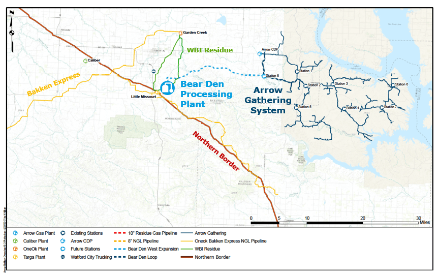 The Bear Den gas processing plants are supported by a 150,000 acreage dedication under long-term contracts with Crestwood’s multiple Arrow producers. Under these contracts, Crestwood purchases 100 percent of oil and gas volumes at the wellhead, allowing Crestwood full control of processing volumes. With Bear Den Phase 1’s 30 MMcf/d capacity in-service, Crestwood will substantially alleviate current curtailments from its third-party processor as well as current flared gas volumes and expects the plant to operate at full utilization by year’s end.
