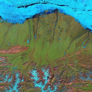 Landsat 7 false-color image of the North Slope. Along the coast, fast ice still clings to the shore in a solid, frozen sheet. At the top of the scene is the drifting sea ice. A dark blue strip of open water, known as a flaw lead, separates the fast ice from the drifting sea ice. The Brooks Range is visible at the bottom. (June 2001)