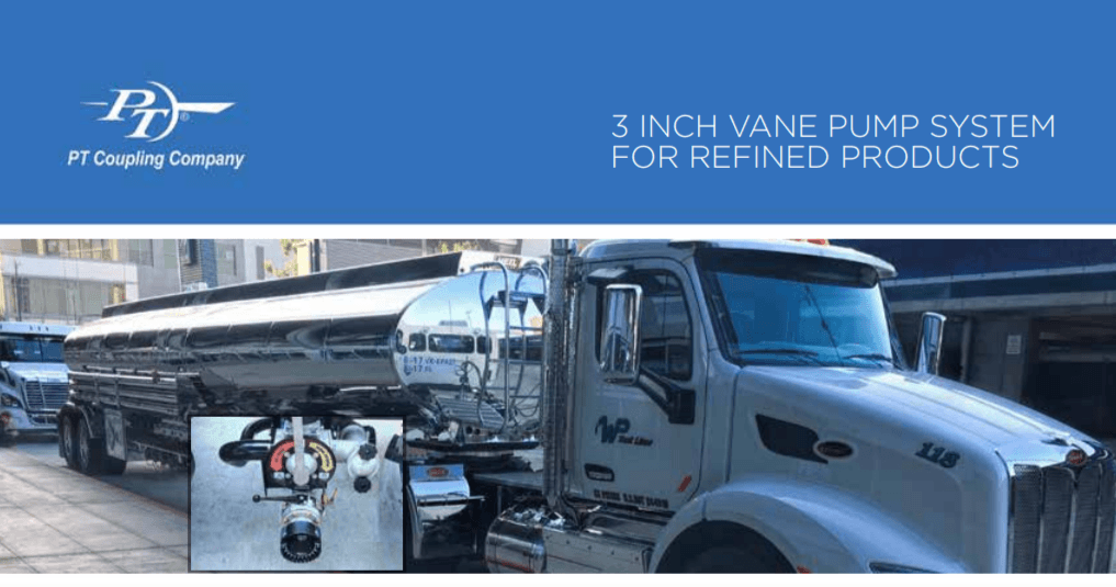 Never blow a hose again! PT Couplingโs Vane Pump System (SPS100414) brings a new level of safety for the environment and truck drivers. PTโs 3โ Vane Pump System is a high-performance truck mount four-way valve system for refined liquid products in the combustible and flammable categories. Products such as: diesel, gasoline, alcohol, avgas, bio-diesel, fuel additives, and synthetic oils. The Vane Pump System delivers where high performance is required, up to 240 gallons per minute (GPM) truck mounted, curb side.