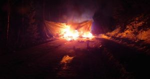 RCMP officers approaching the site from the Marten Forest Service Road said they encountered a burning blockade of downed trees, tar-covered stumps, wire and boards with spikes driven through them. PHOTO BY RCMP