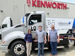 King Countyโs Solid Waste Division will operate the Kenworth T680E to transfer refuse… (From left: Glynda Steiner, King County Solid Waste Division deputy director; Pat McLaughlin, King County Solid Waste Division director; and Mitch Hatfield, general manager of Papรฉ Kenworth for the Northwest and Alaska.)