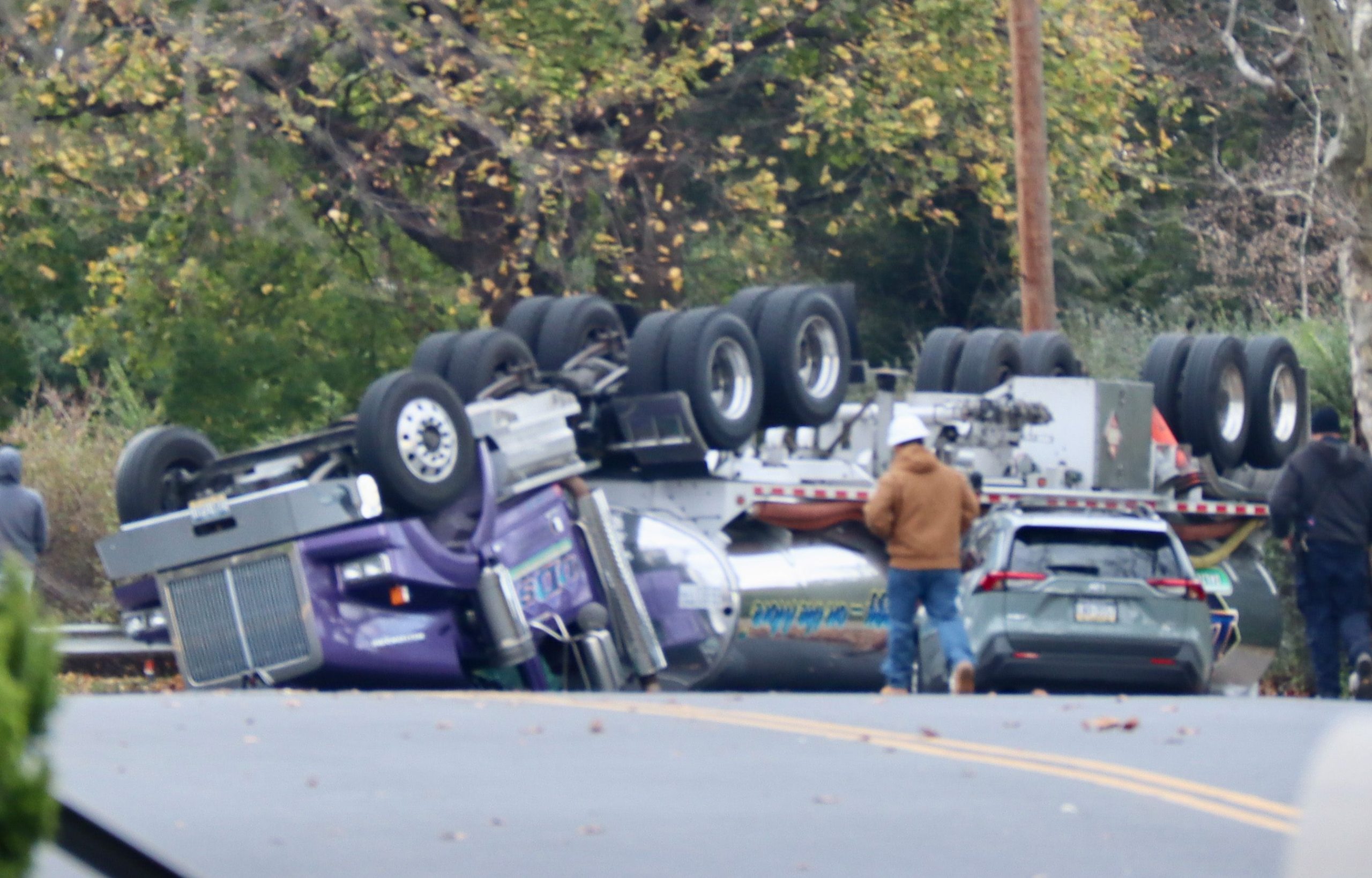 About 2:08 a.m., city police responded to the intersection, where a Dalton Delivery Service tanker truck carrying about 6,000 gallons combined of gasoline and diesel fuel overturned, according to a news release from police Capt. Nicholas P. Lechman.