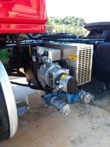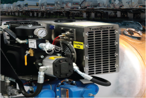 Polar Pac is engineered to mount to the frame rail of a truck with no drilling required. It needs only 20 inches of space. It has a modular design with reservoir and cooler and is not difficult to install, Buckley said. It can be configured with an oil-free vane compressor, piston compressor, or 3”Ranger gear pump, 3” Blackmer vane pump, S.S. chemical or food grade pump.