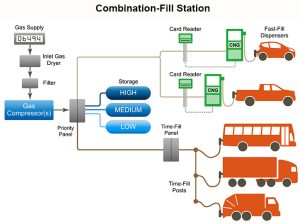 CNG station infrastructure types: Fast-fill, Time-fill, and Combination-fill