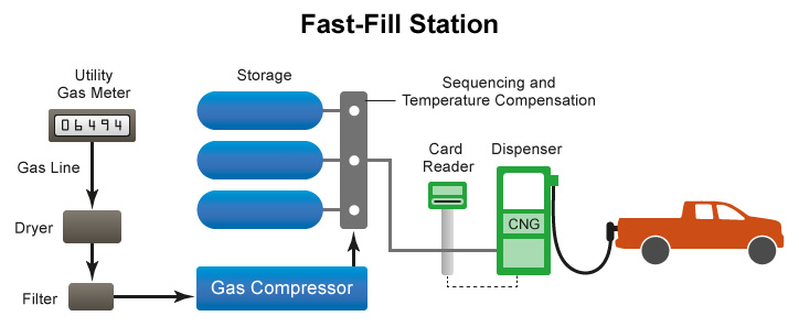 Fast-fill CNG stations are best suited for retail situations where vehicles arrive randomly and need to fill up quickly. All public CNG stations have a fast-fill option. These stations receive fuel from a local utility line at a low pressure and then use a compressor on site to compress the gas to a high pressure. Once compressed, the CNG moves to a series of storage vessels so the fuel is available for a quick fill-up. CNG can also be delivered via dispensers alongside gasoline or other fuel dispensers.