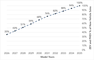 - Advanced Clean Trucks (ACT) Rules: Under California’s Advanced Clean Trucks rules, 75% of new Class 4–8 trucks sold in the state must be zero-emission vehicles (ZEVs) by 2035. This is part of the larger Advanced Clean Cars II (ACCII) program, which aims to transform the vehicle industry in the state towards sustainability.